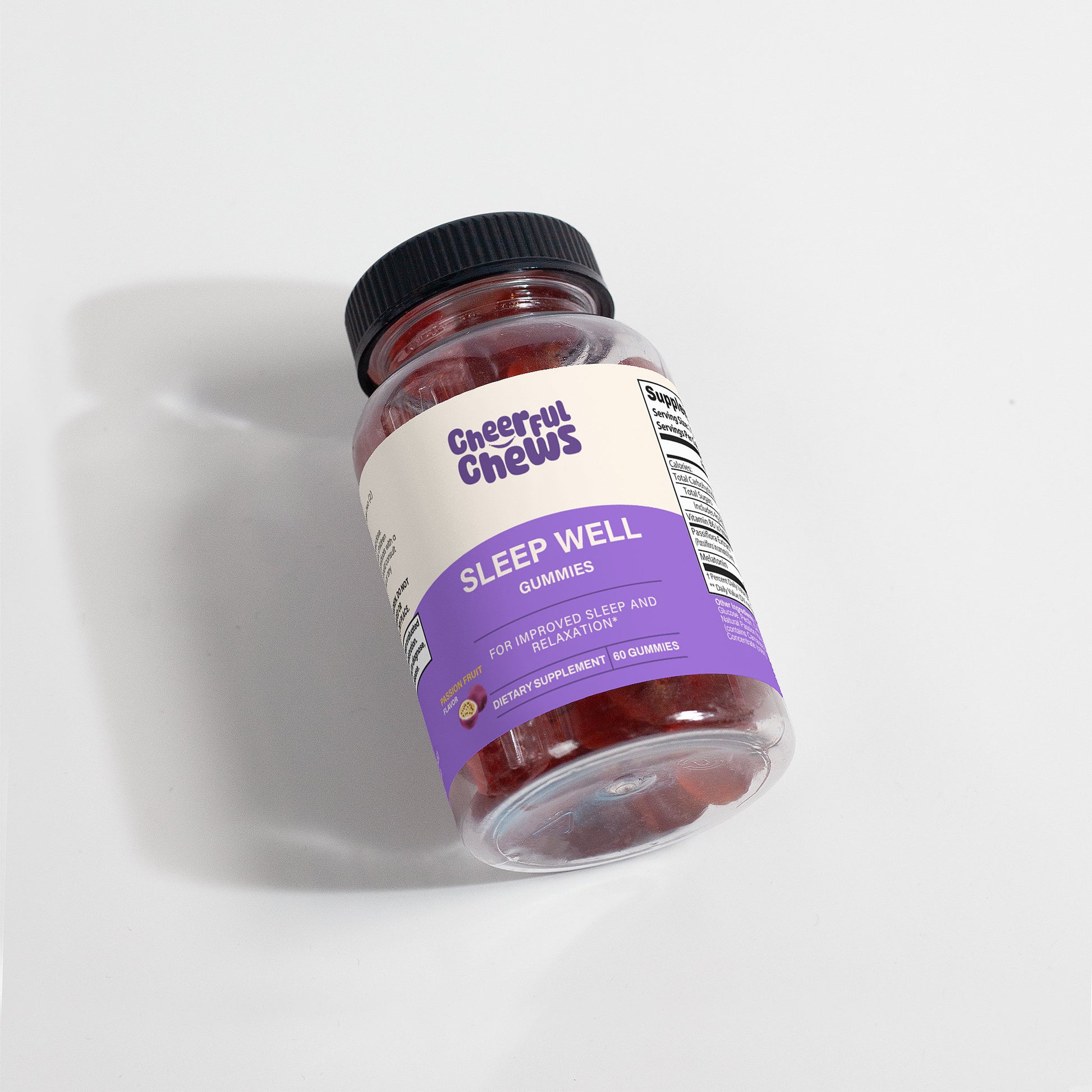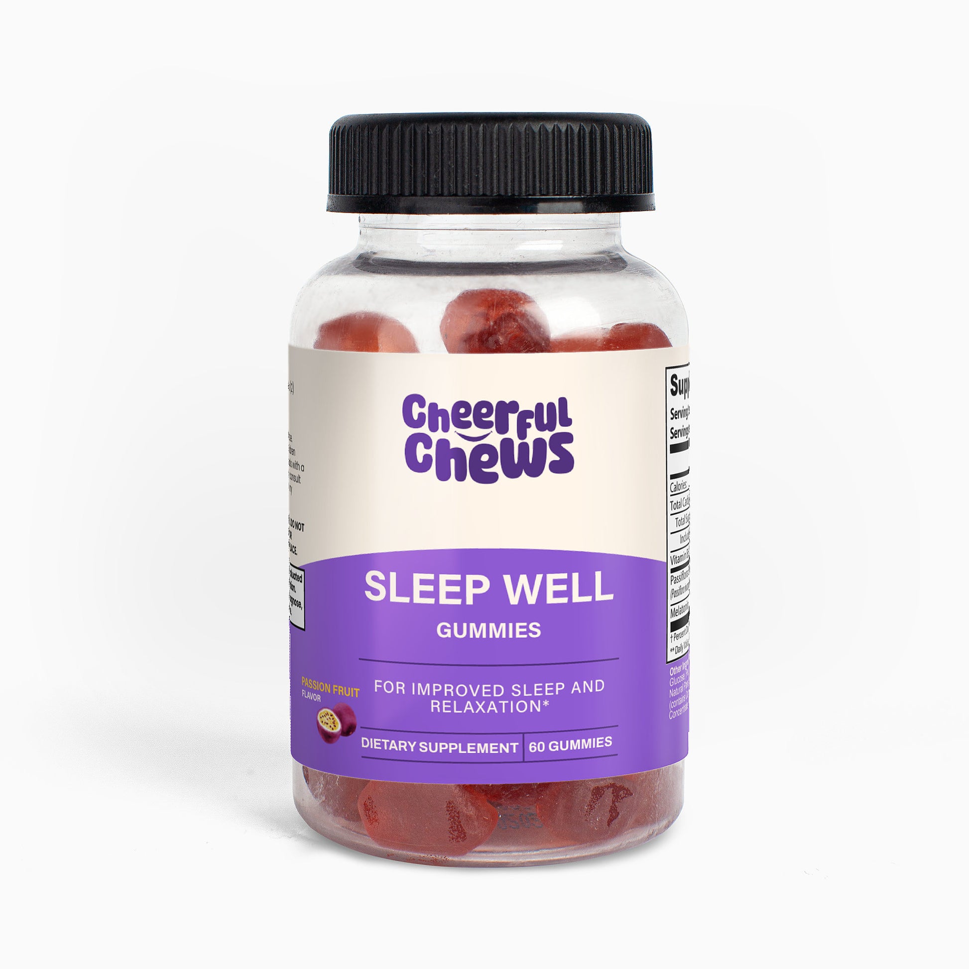 Passiflora Extract (Passiflora incarnate)(herb), Melatonin, Glucose Syrup, Sugar, Glucose, Pectin, Citric Acid, Sodium citrate, Natural Passion fruit flavor, Vegetable Oil (contains Carnauba Wax), Purple Carrot Juice Concentrate (Color).
